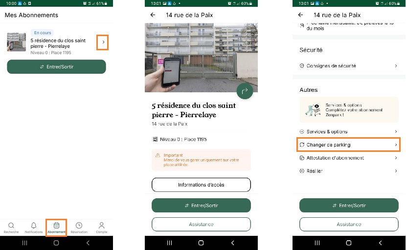 💻 Vous pouvez également le faire depuis votre compte web : cliquez sur l'onglet "Abonnements" puis sur le bouton "Gérer" et "Changer de parking".