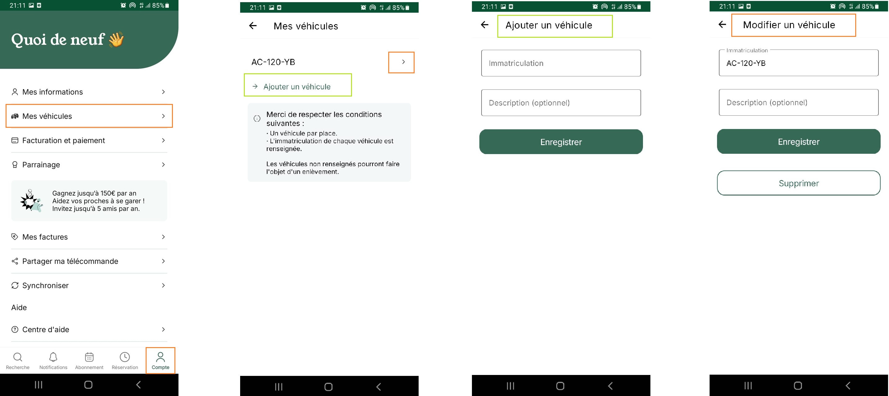 Depuis l'application, rendez-vous dans l'onglet Compte puis accéder à la rubrique " Mes véhicules".