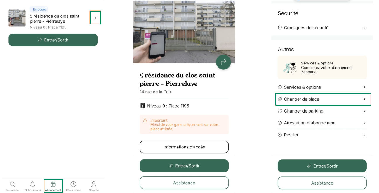 ⚠️ Si aucune place n’apparaît, le parking est complet. Il faudra attendre qu’une place se libère pour pouvoir changer.