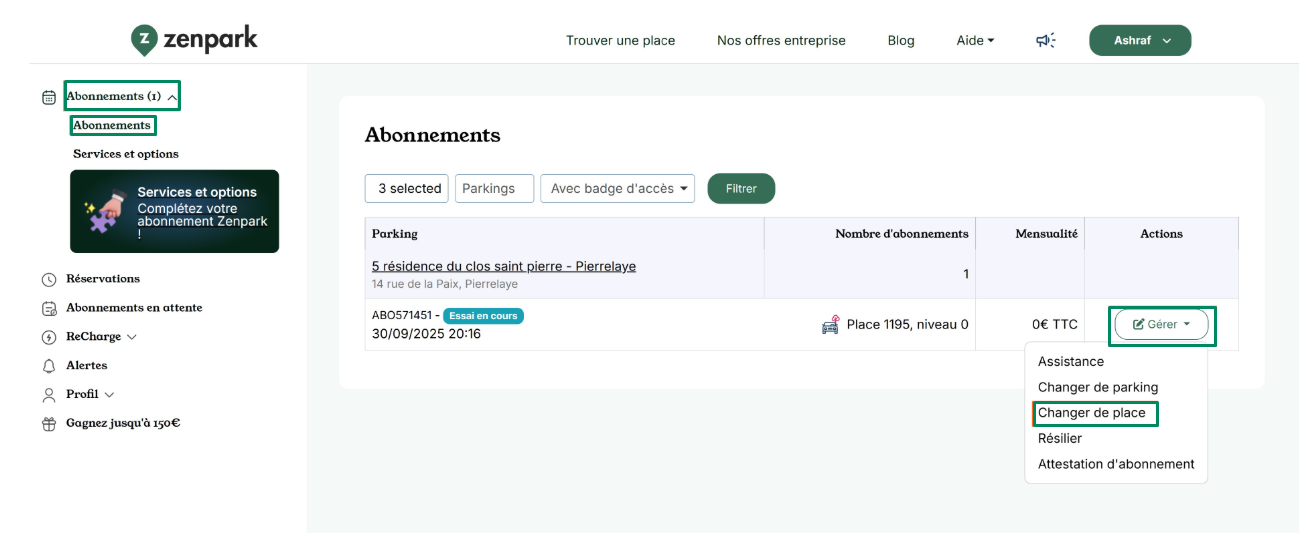 🔧 Cliquez sur Gérer → Changer de place pour visualiser et sélectionner une nouvelle place