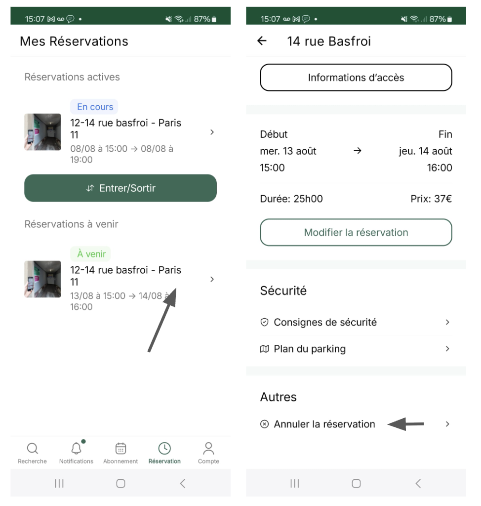 Pour annuler une réservation, vous pouvez le faire directement dans l'application depuis le bouton : "Annuler la réservation", disponible dans l'onglet "réservation", sélectionnez la réservation concernée et cliquez en bas de l'écran sur "annuler la réservation" :