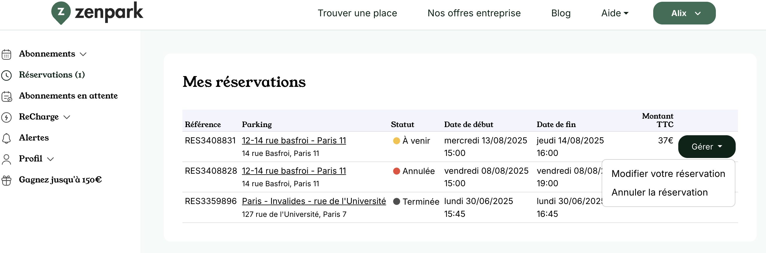 Puis cliquez sur "Réservations" > "Gérer" > "Annuler la réservation"